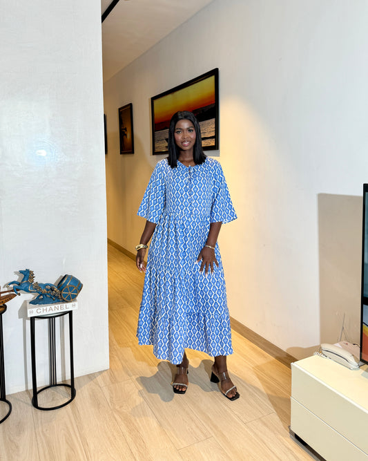 Blue Shirred Waist Tiered Hem Maternity Midi Dress