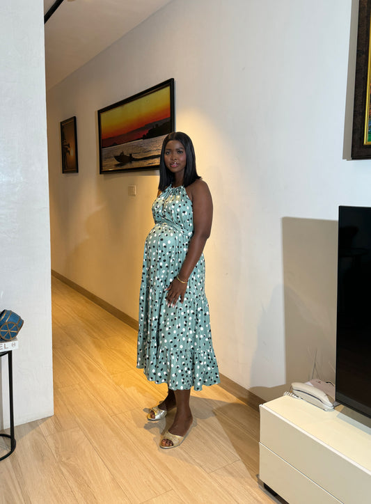 Halterneck Tiered Polka Dot Maternity Green Dress